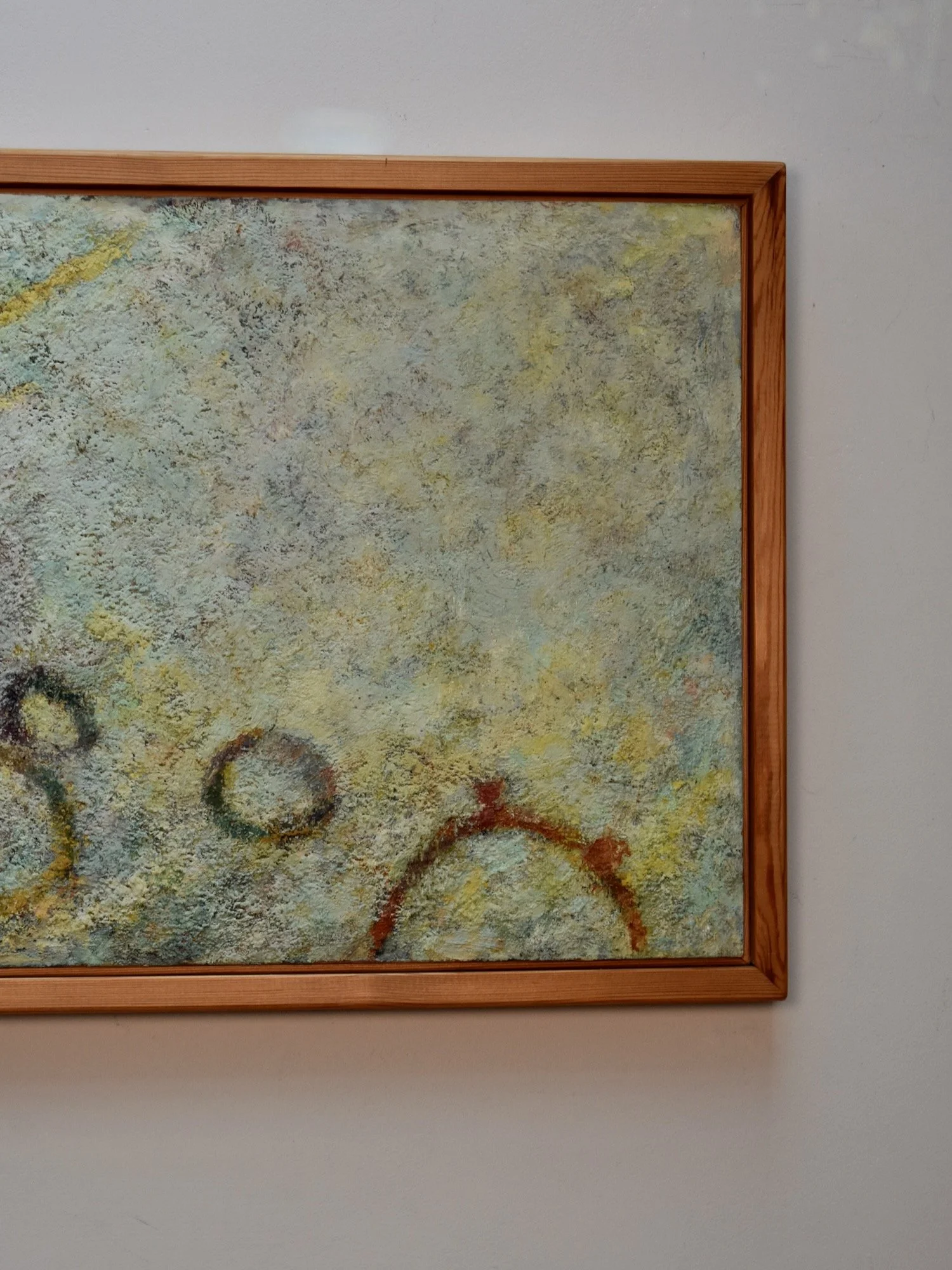 The painting is richly layered, with creams, yellows, greens, blues and orange tones merging to form a complex, tactile surface. Organic and geometric forms drift across the composition, their softened edges creating a sense of rhythm and movement. Though abstract, the work has a subtle figurative undercurrent, typical of Smith’s lyrical approach.